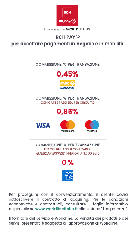 REP S.r.l. (RCH Electronic Payments) è una società partecipata da RCH SpA e Worldline Merchant Services Italia. Si occupa di soluzioni di pagamento hardware e software, sia integrate di sistemi di cassa che stand alone, dedicate a commercianti, artigiani e liberi professionisti per gestire con flessibilità le richieste di pagamento contactless sui differenti circuiti.